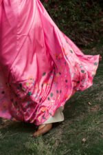 PINK SATIN CARDIGAN WITH MULTICOLOR FLORAL BORDERS AND SILVER STRASS FOR A FRESH, LIVELY LOOK.