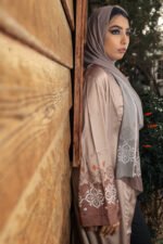 .كارديجان ساتان بلون الكافيه، مزين بنقشة زخرفية بدرجات البني، بملمس ناعم ولمعة خفيفة بتدي إحساس هادي وشيك