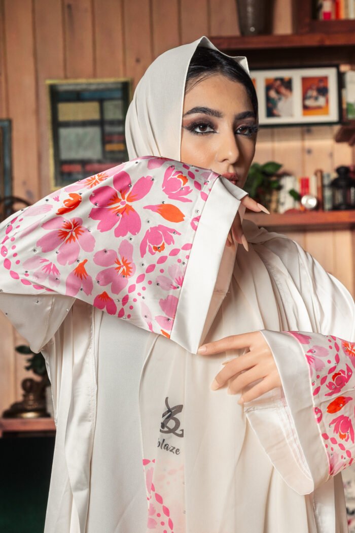 .كارديجان ساتان باللون الأوف وايت، مزين بنقشة بينك بدرجات مختلفة، بملمس ناعم ولمعة خفيفة بتدي إحساس رقيق وأنثوي