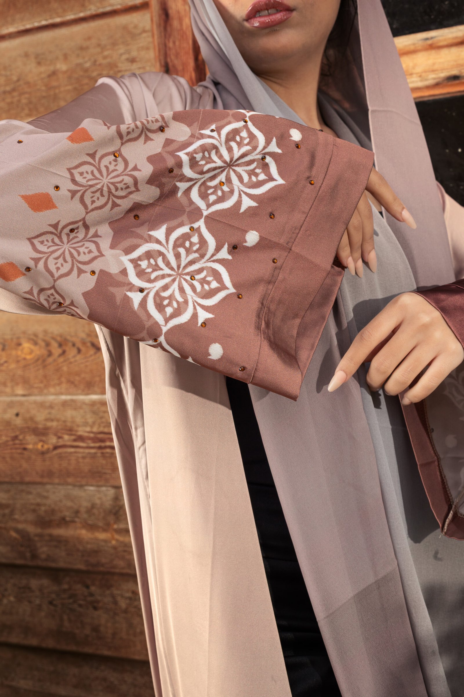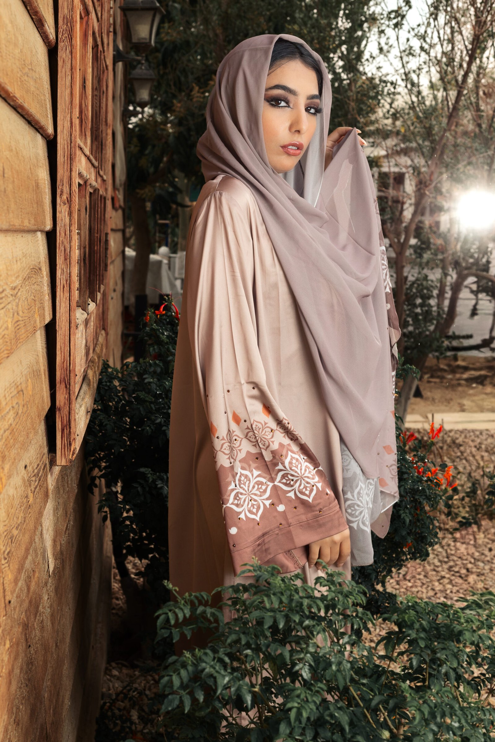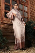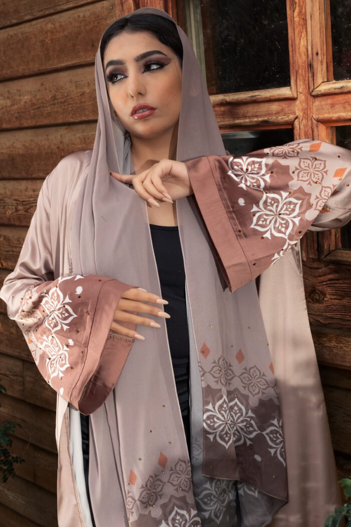 .كارديجان ساتان بلون الكافيه، مزين بنقشة زخرفية بدرجات البني، بملمس ناعم ولمعة خفيفة بتدي إحساس هادي وشيك