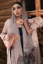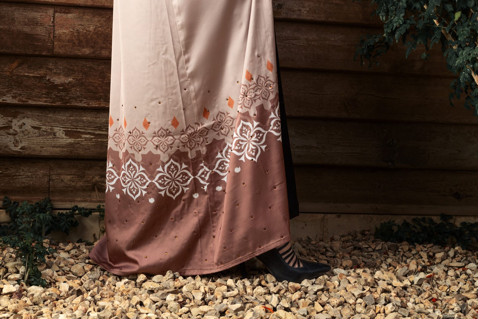 The ornamental pattern is placed along the hem and sleeves, adding depth and a sophisticated contrast.