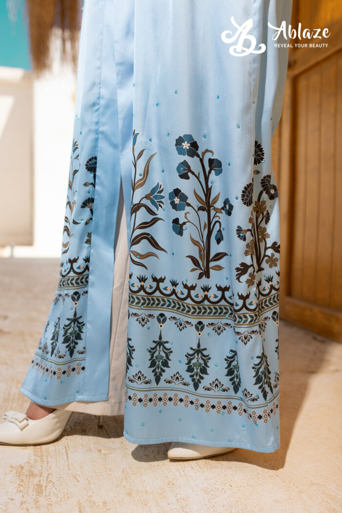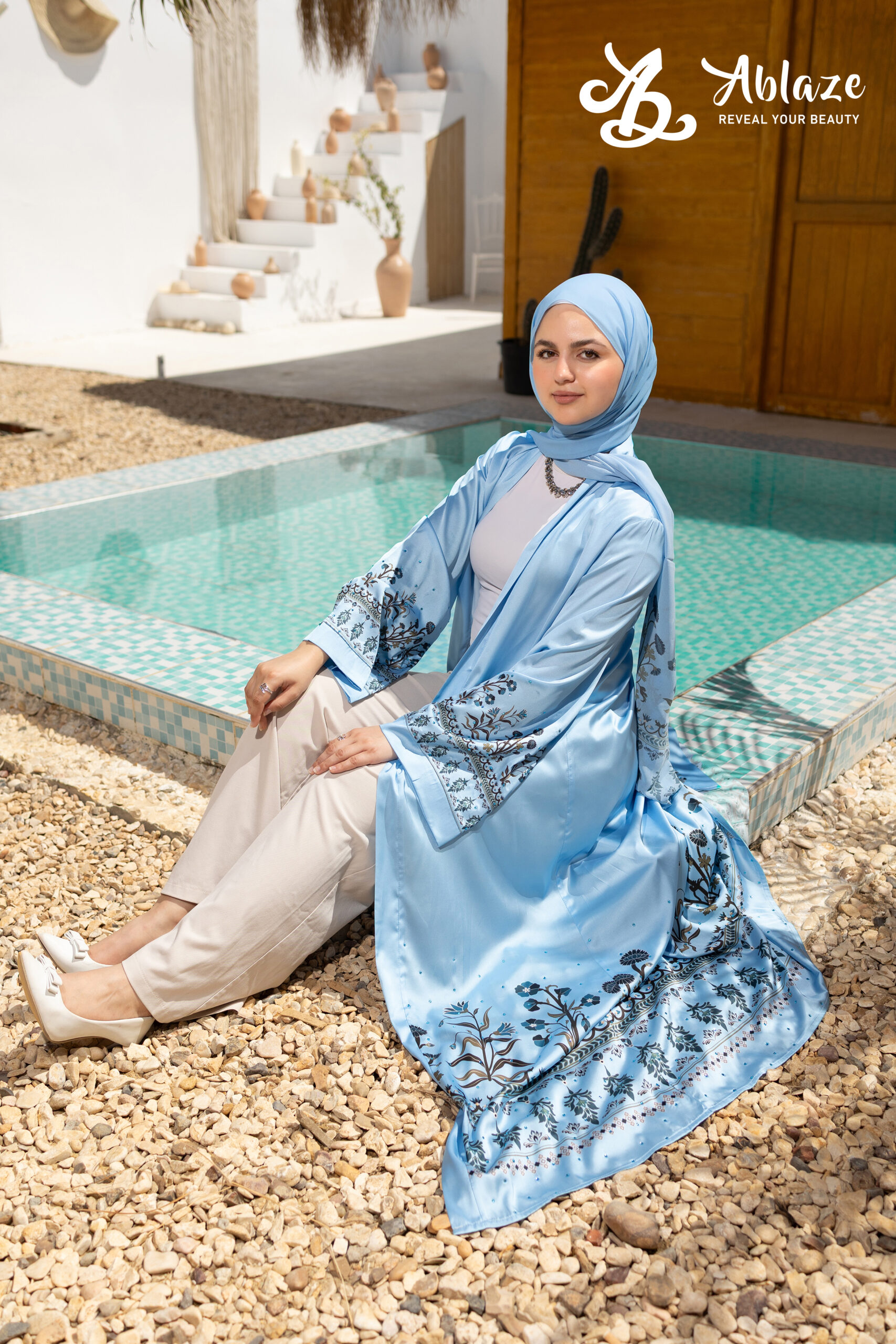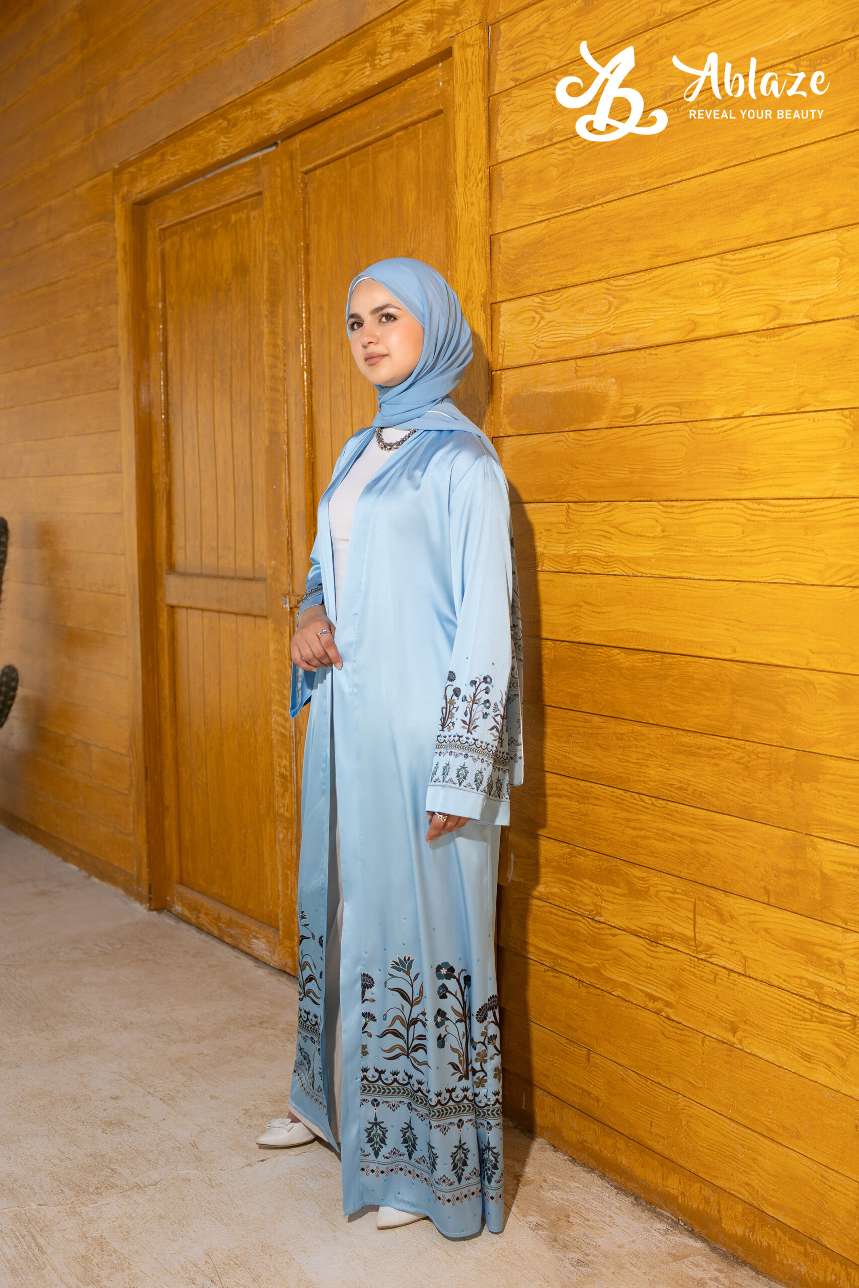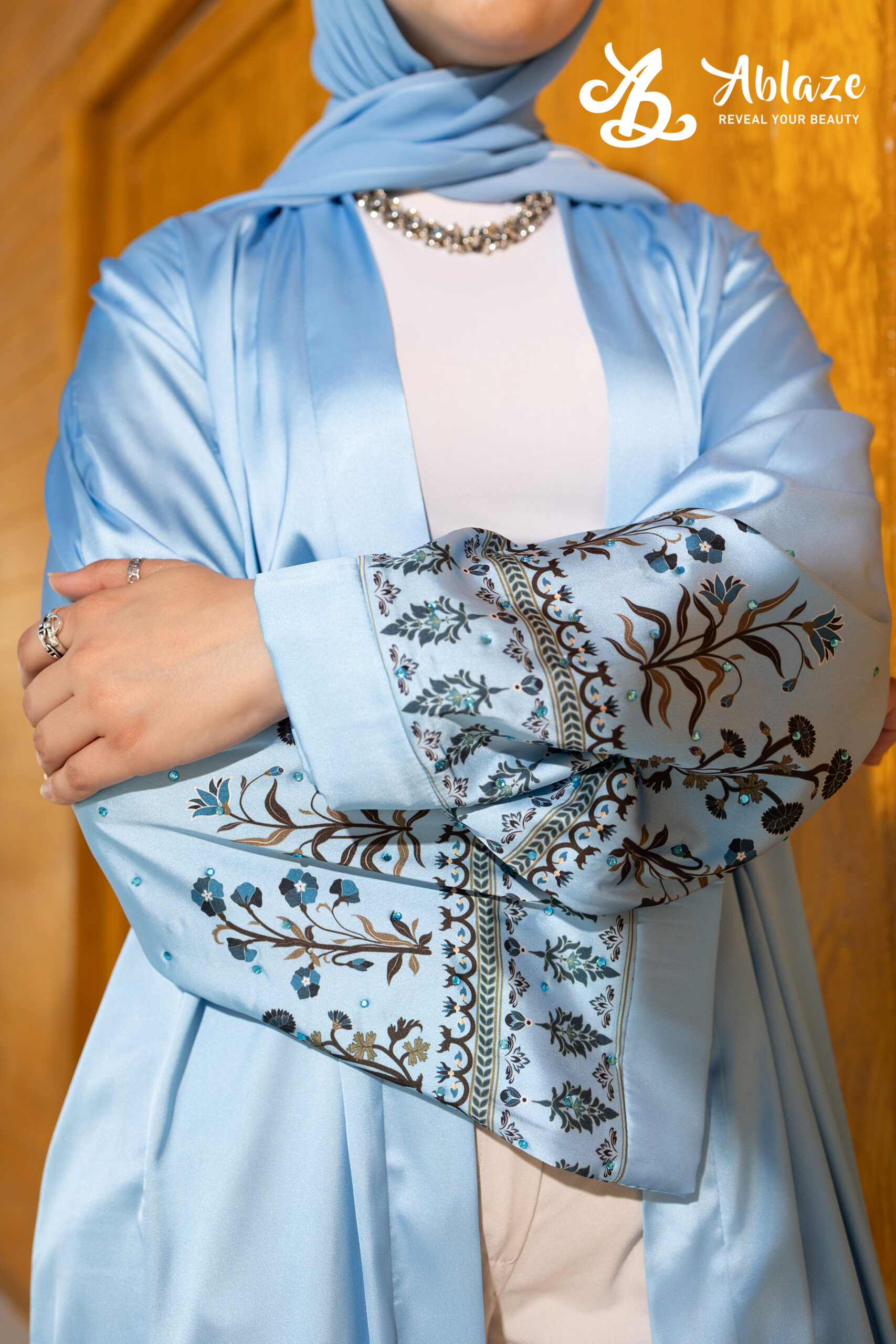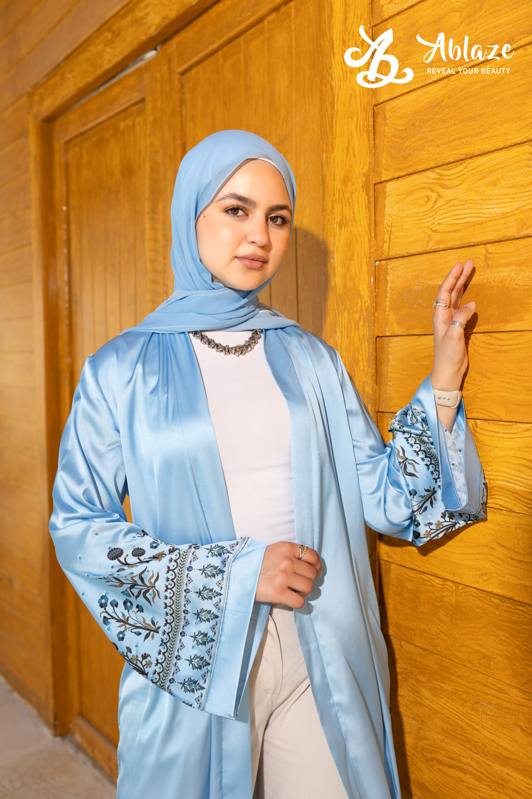 - ✦ الستراس: أزرق على النقشة في الأكمام ونهاية الكاردجان لانسجام كامل في اللون