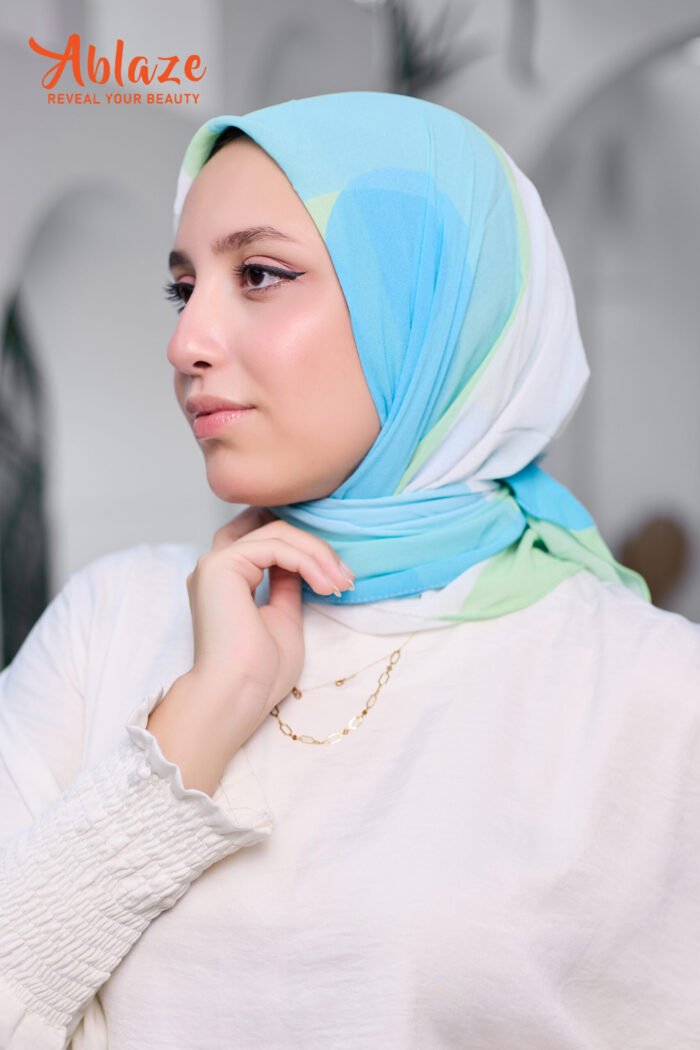 COMBINES COOL BLUES AND VIBRANT GREENS IN SOFT ABSTRACT STROKES. A SCARF THAT FEELS AS REFRESHING AS A BREEZE.