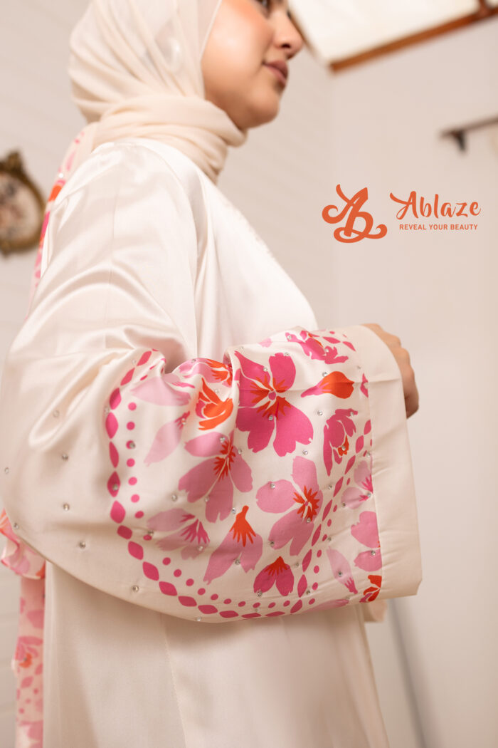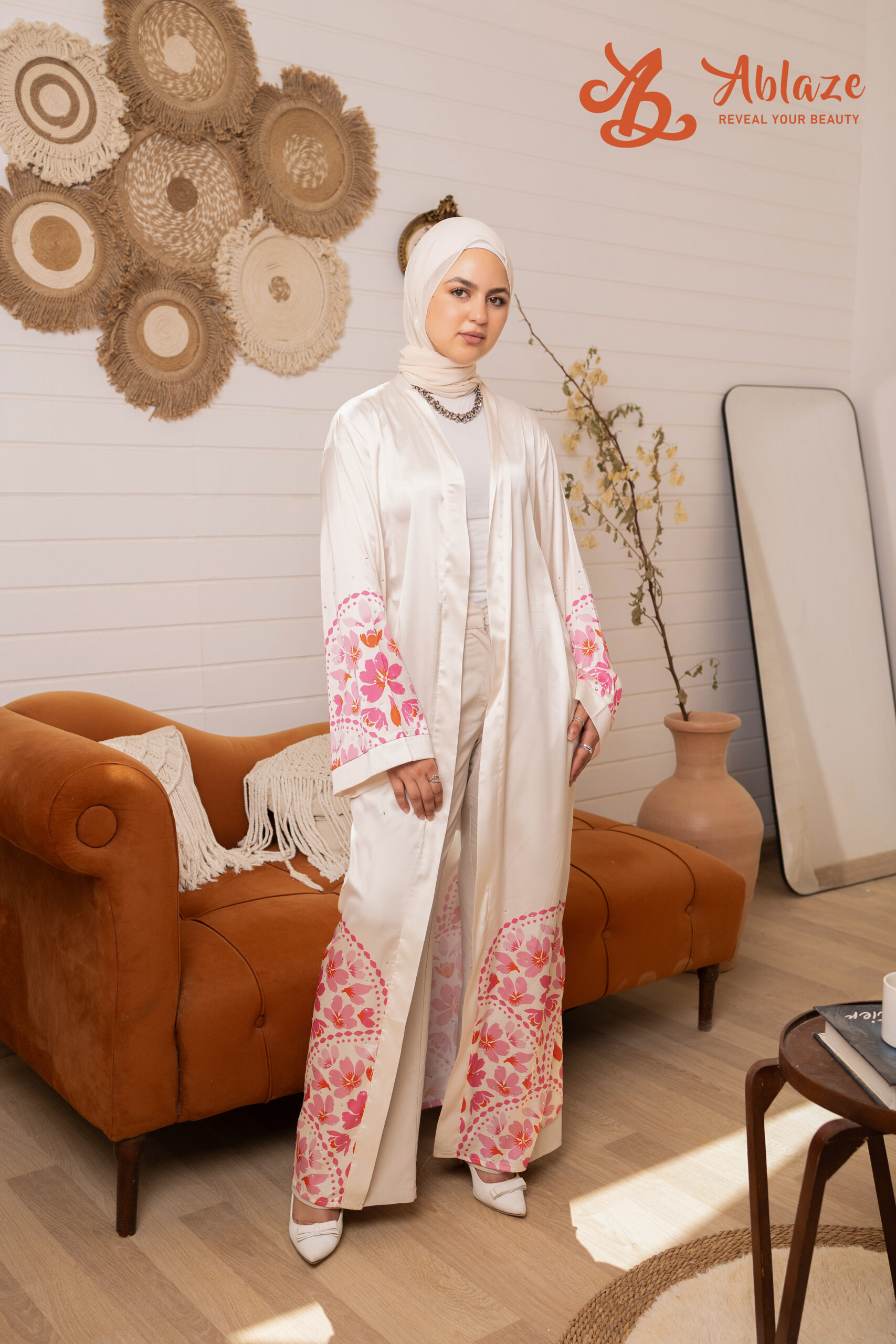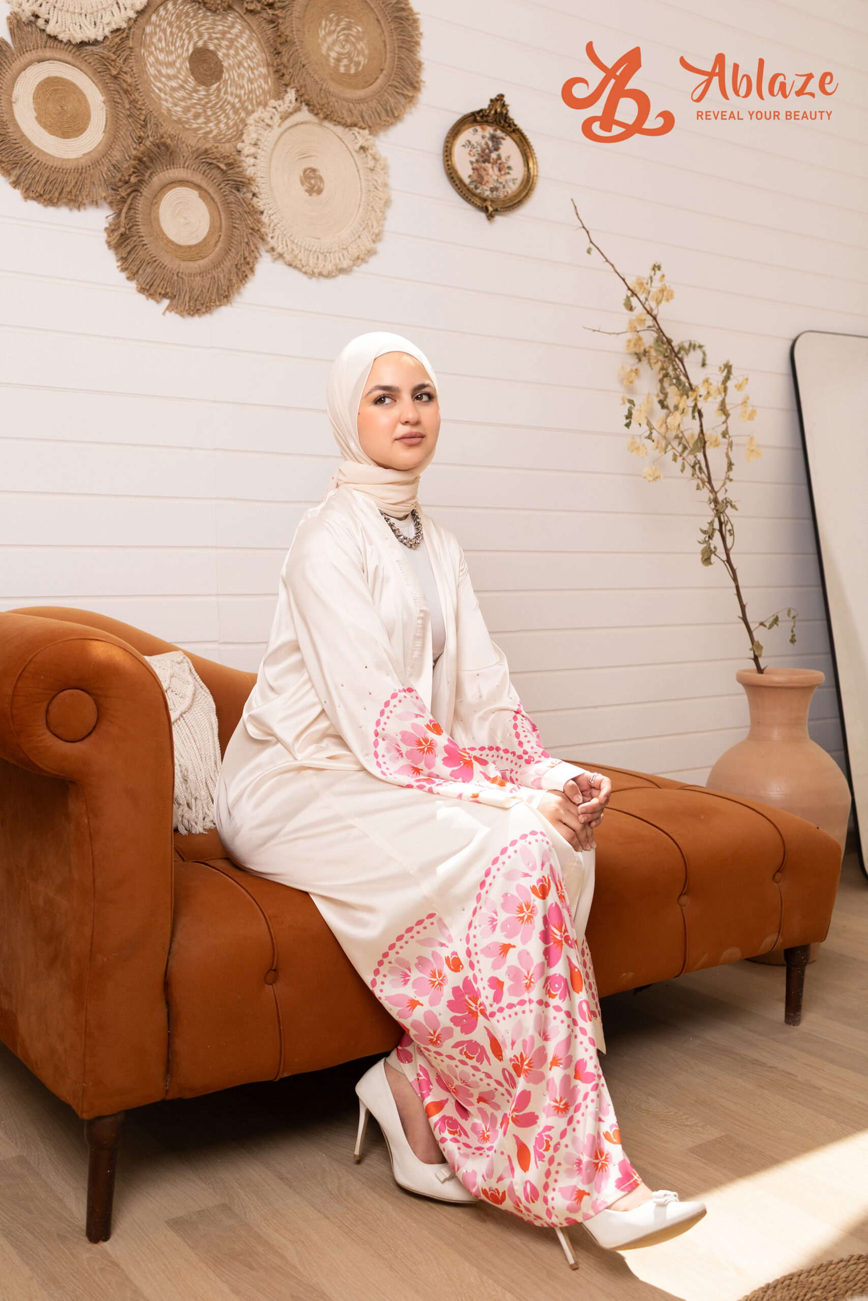 - ✦ التصميم: نقوش وردية ناعمة على الأكمام ونهاية الكاردجان