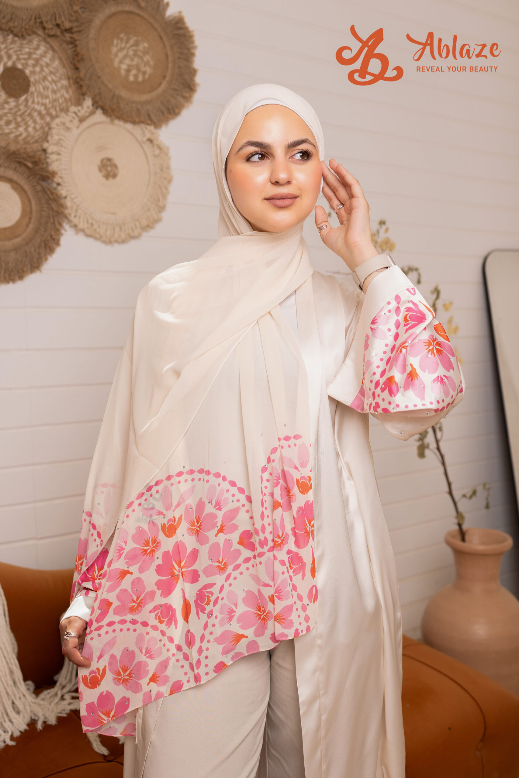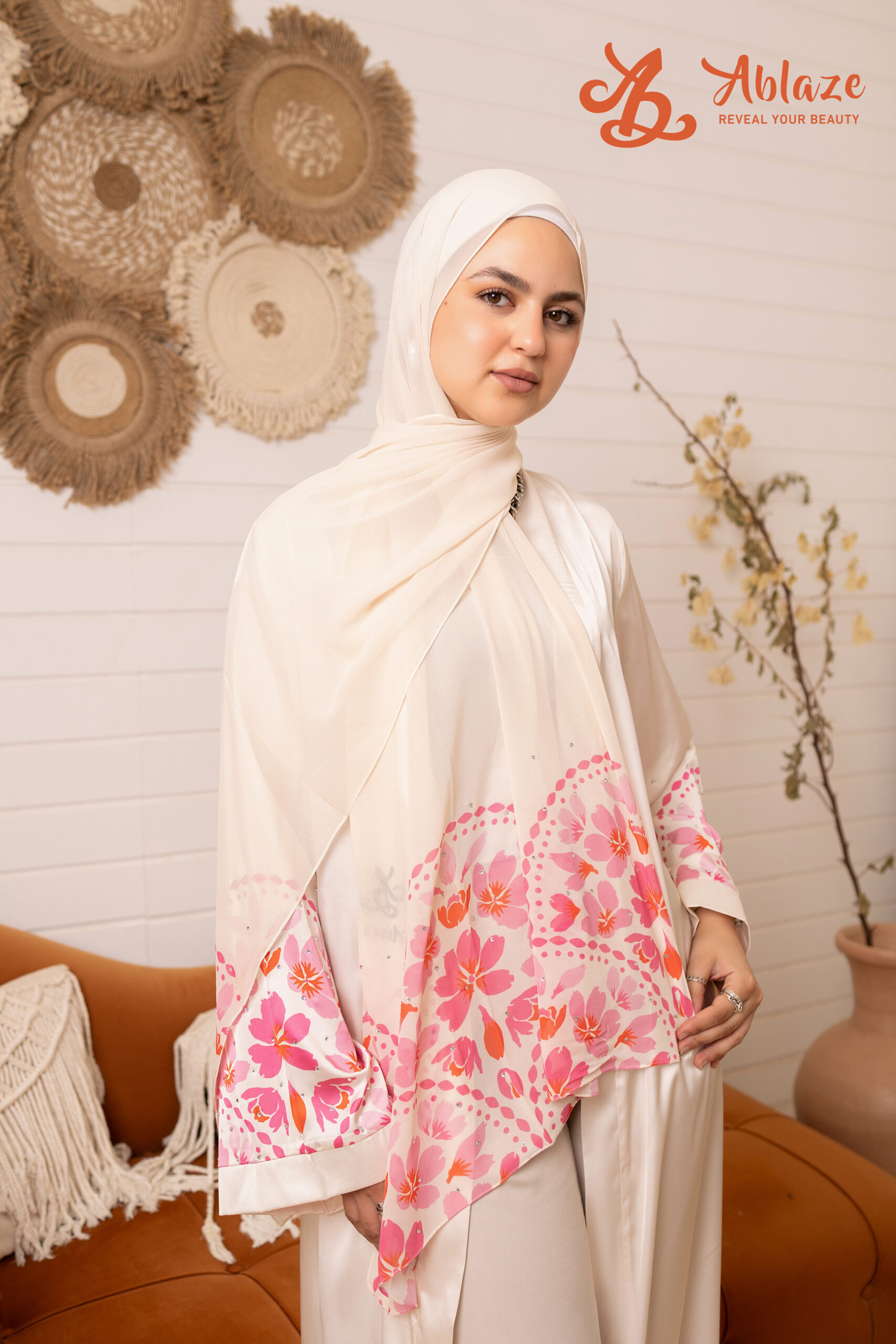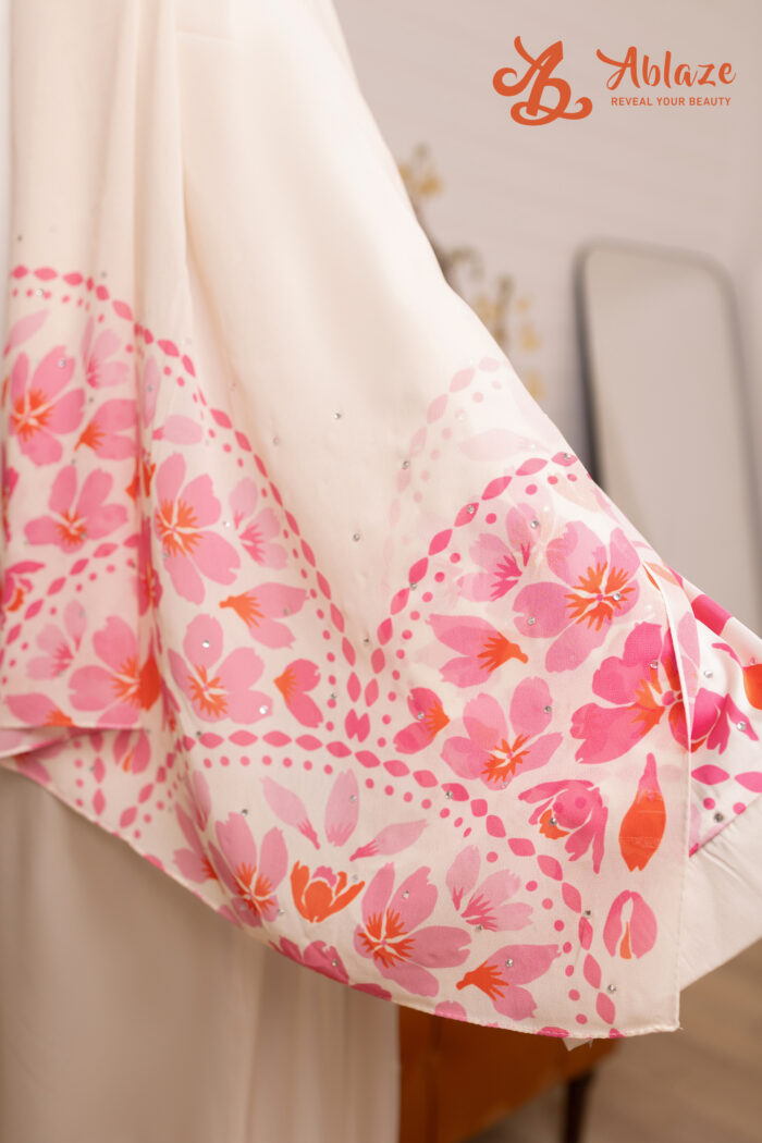الطرحة دي معمولة للي تحب اللوك الناعم والبسيط اللي فيه رقي واضح. اللون الأوف وايت مع التفاصيل الوردية والستراس الفضي
