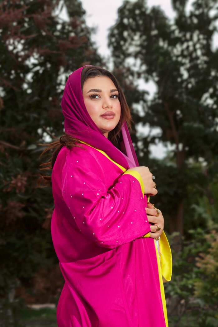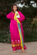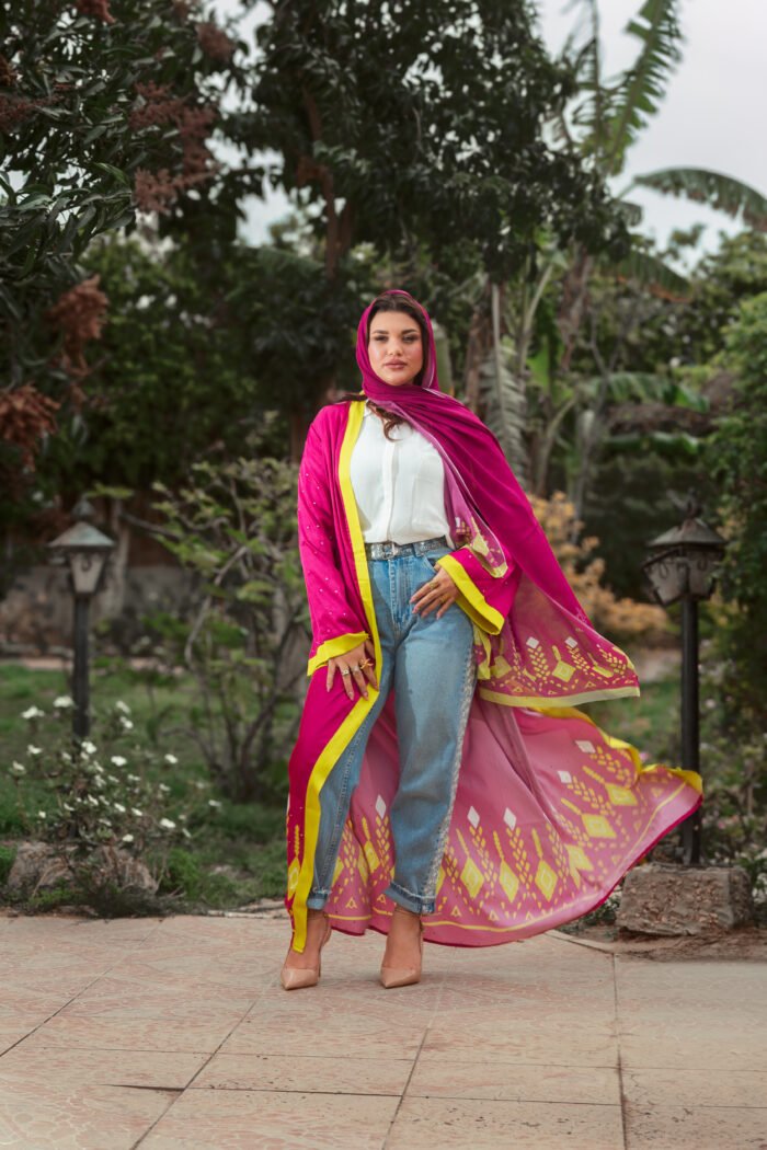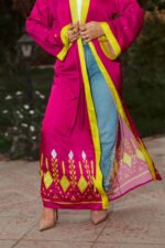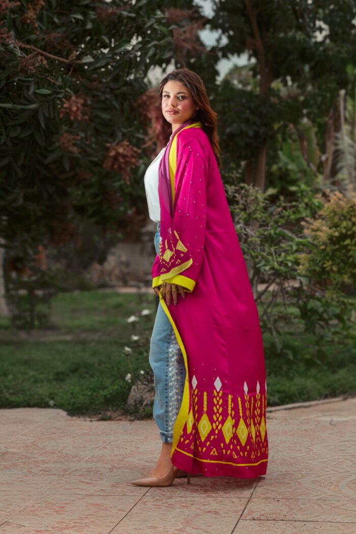 FUCHSIA SATIN CARDIGAN WITH YELLOW GEOMETRIC BORDERS AND SILVER STRASS FOR A BOLD, VIBRANT LOOK.